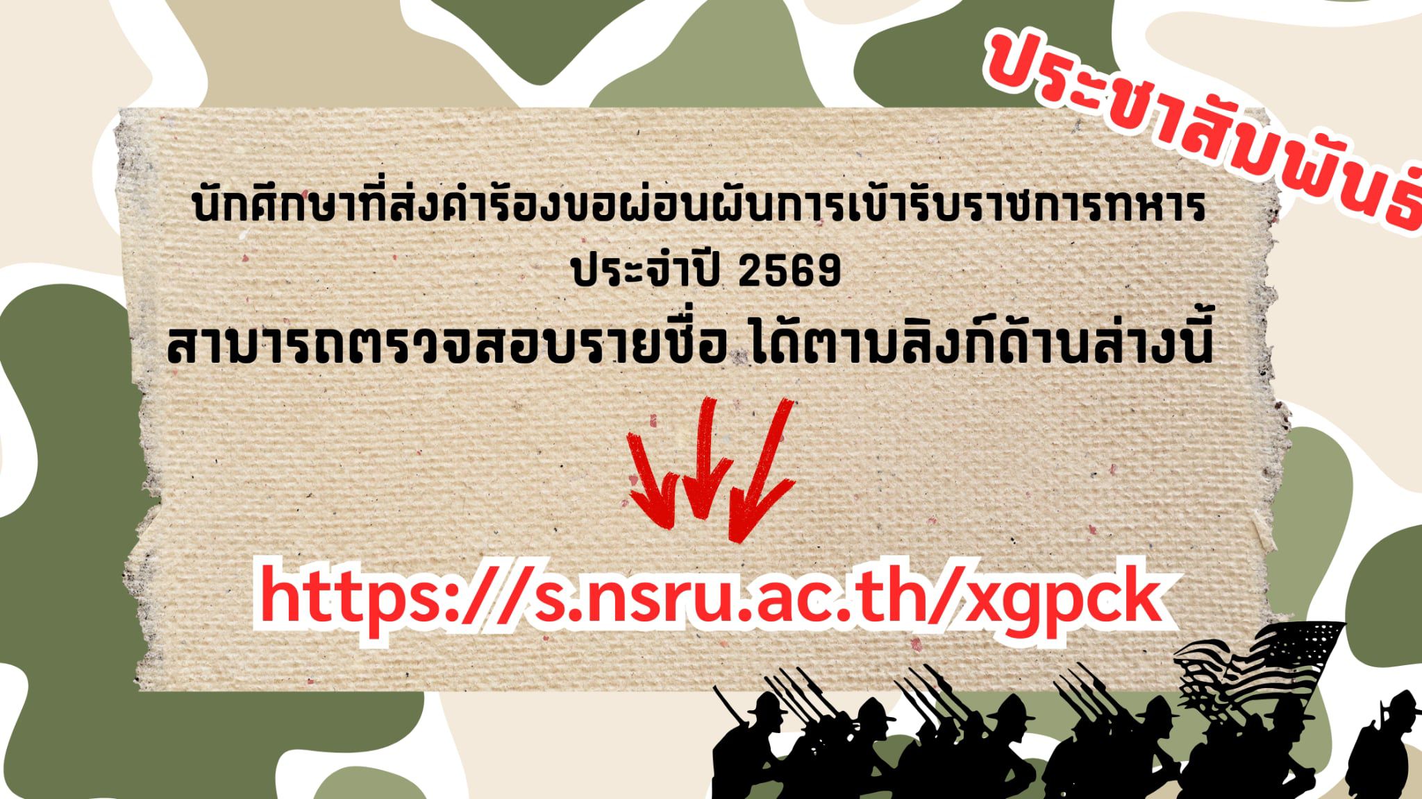 ประชาสัมพันธ์ นักศึกษาที่ส่งคำร้องขอผ่อนผันการเข้ารับราชการทหาร ประจำปี 2569 สามารตรวจสอบรายชื่อ ได้ตามลิงค์ด้านล่างนี้ https://s.nsru.ac.th/xgpck