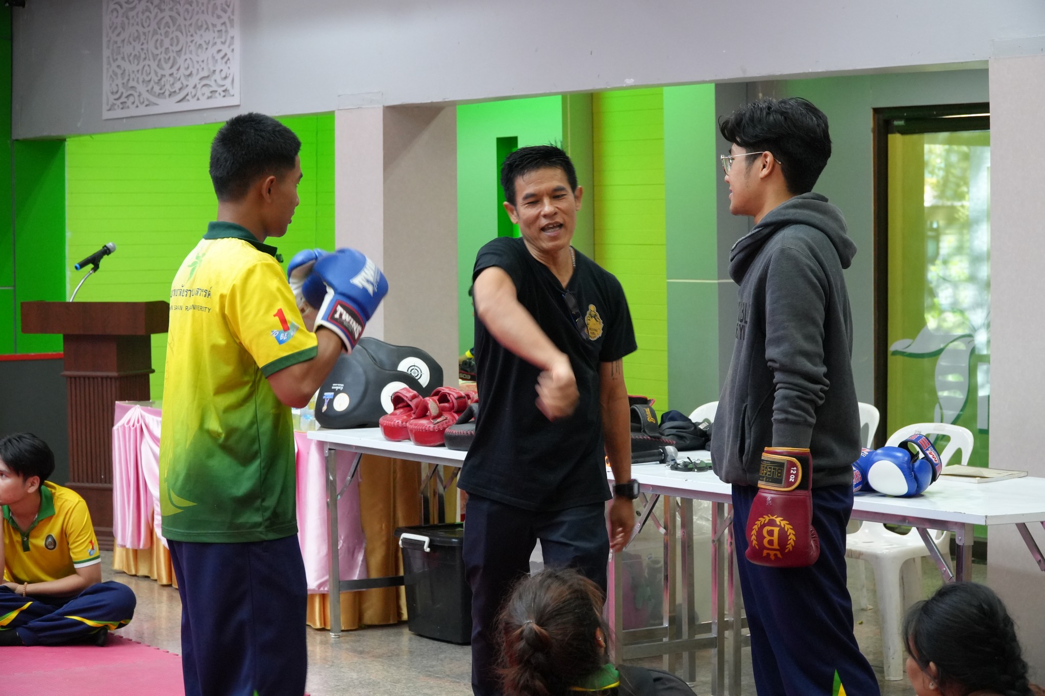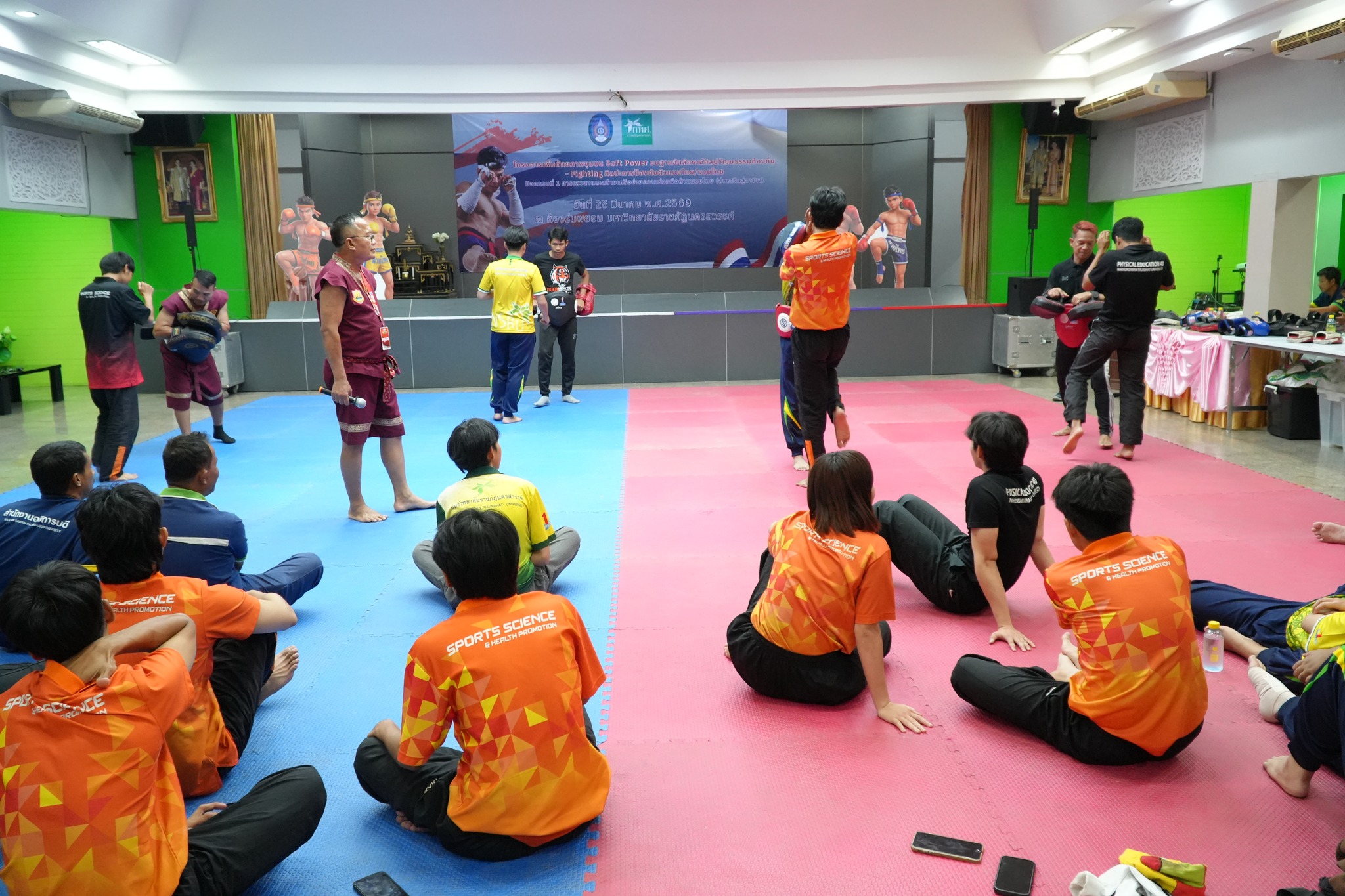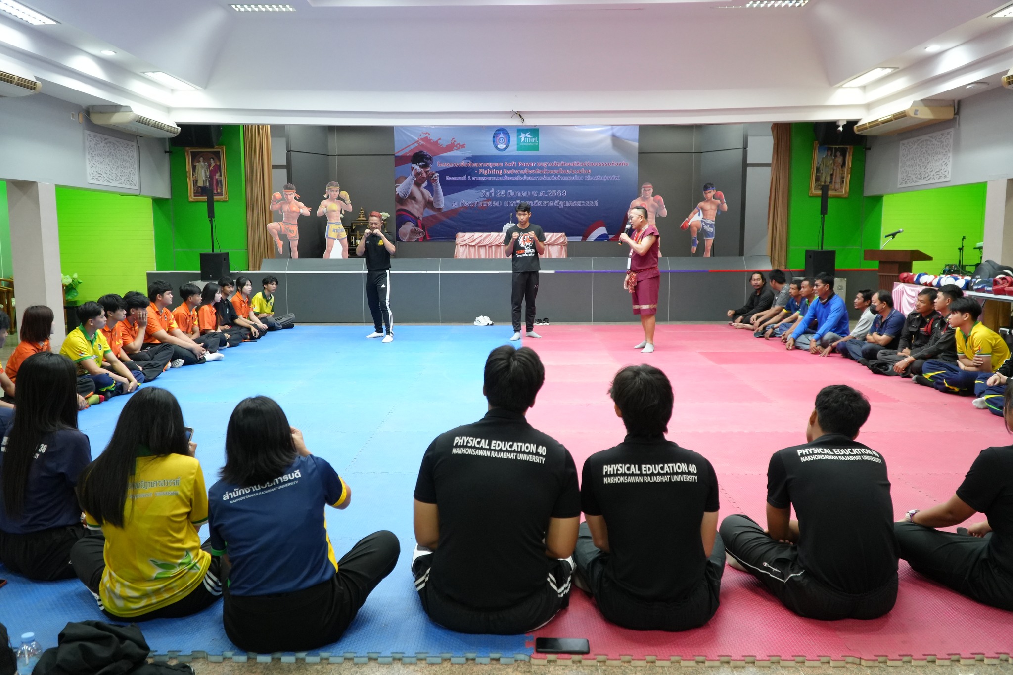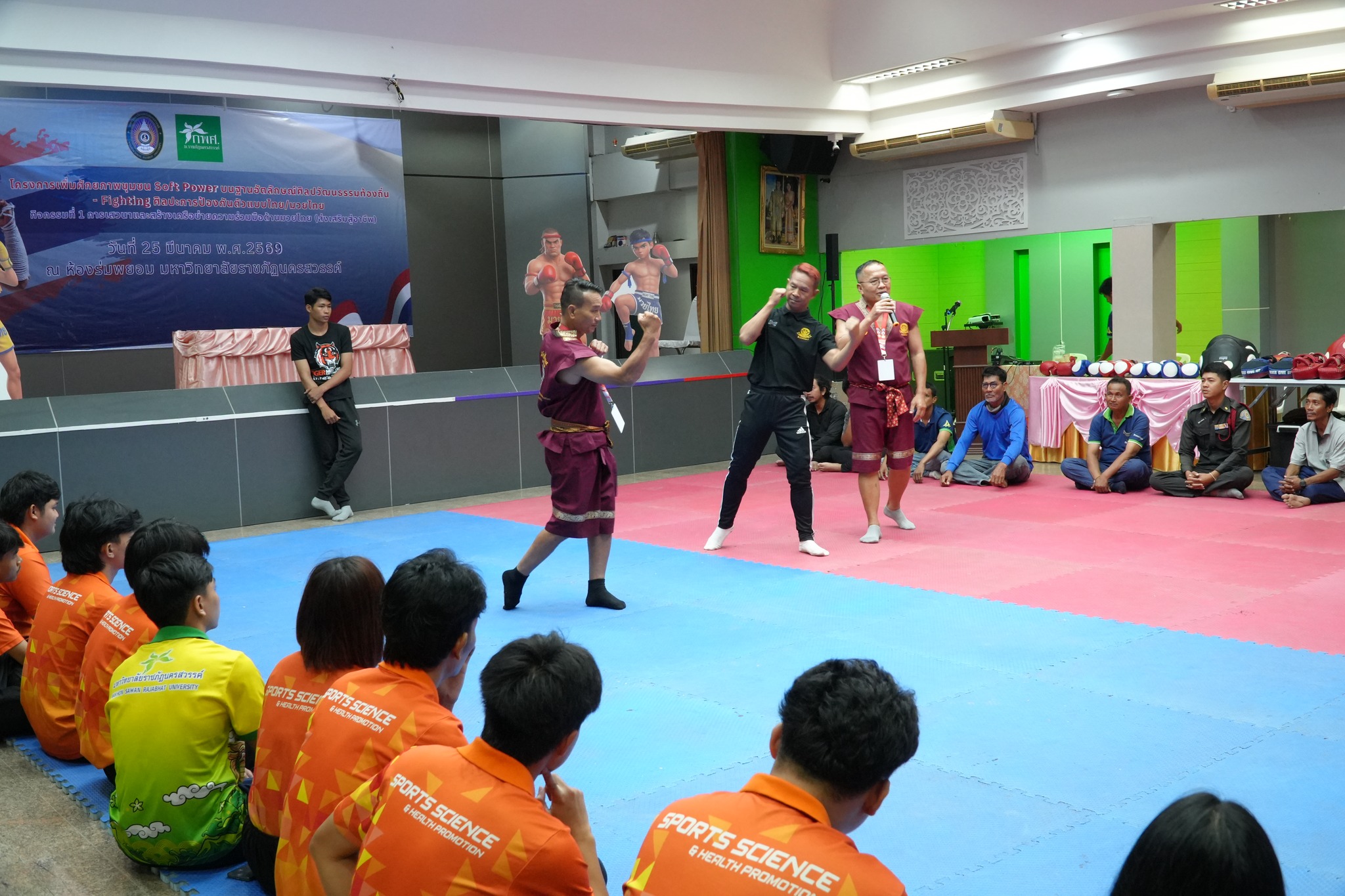 ภายในกิจกรรม ผู้เข้าร่วมซึ่งเป็นนักศึกษาและบุคลากรที่สนใจ ได้รับทั้งความรู้เชิงทฤษฎีและการฝึกปฏิบัติจริงอย่างเข้มข้น โดยมีวิทยากรผู้เชี่ยวชาญ ได้แก่ อาจารย์สมพงษ์ แก้วกัณหา จากค่ายมวย ช.ไทยเศรษฐ์ คุณณกรณ์ ศรีจิ๋ว และ จ่าสิบตำรวจ กฤษณะ วรรณสุทธะ ร่วมถ่ายทอดองค์ความรู้ด้านมวยไทย ตั้งแต่พิธีไหว้ครู ทักษะพื้นฐาน “นวอาวุธ” การเตะ เข่า ศอก การฝึกซ้อมกับเป้าล่อ (Pad Work) ตลอดจนเทคนิคการป้องกันตัวในสถานการณ์จริง