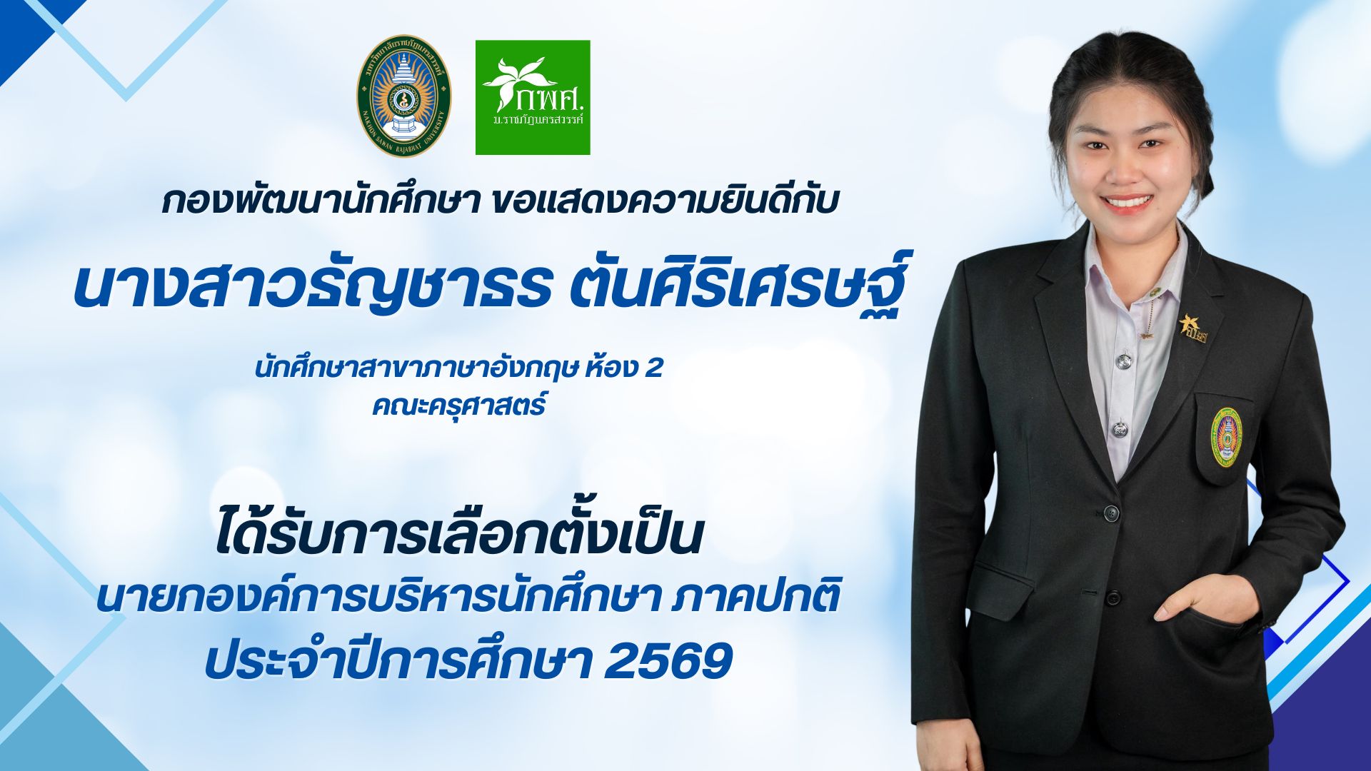 นางสาวธัญชาธร ตันศิริเศรษฐ์ เป็นผู้ที่ได้รับการเลือกตั้งให้ดำรงตำแหน่งเป็น “นายกองค์การบริหารนักศึกษา ภาคปกติ ประจำปีการศึกษา ๒๕๖๙”